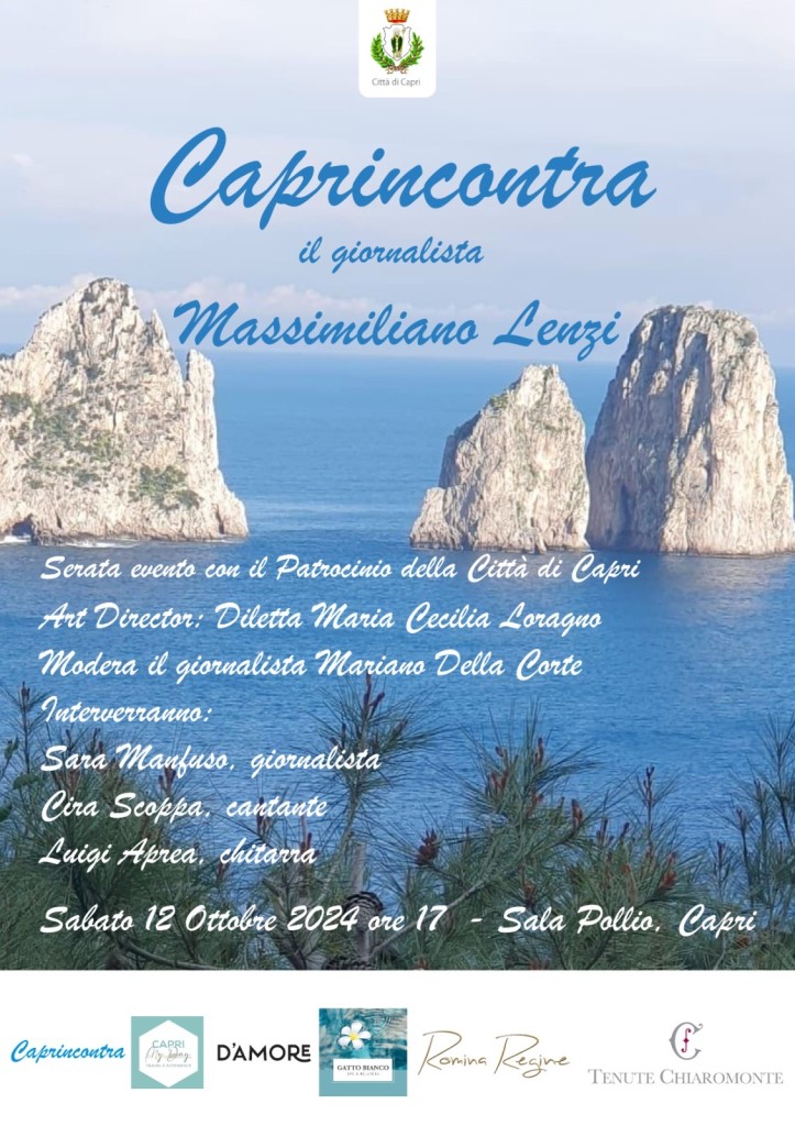L’evento, ideato e organizzato dalla giornalista Diletta Maria Cecilia Loragno, art director dal 2017 della rassegna caprese ‘Caprincontra’, sarà moderato dal giornalista de ‘Il Mattino’ Mariano Della Corte e vedrà la partecipazione di due artisti capresi: la cantante lirica Cira Scoppa, accompagnata dalla chitarra di Luigi Aprea.