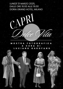 Lunedì 31 marzo p.v. presso il Doria Grand Hotel di Milano si terrà una serata evento dedicata alla bellissima Isola di Capri, meta da sempre amata da intellettuali, artisti, letterati e dal jet set internazionale. Ospiti confermati della serata, organizzata dal Rotary Club Milano International Net insieme al Rotary Club Milano Scala, Paolo Falco, Sindaco della Città di Capri, Melania Esposito, Assessore al Turismo e Cultura della Città di Capri, Luciano Garofano, Giornalista e Scrittore, Lucio Gaeta, titolare del Ristorante "Il Geranio" di Capri, Massimiliano Finazzer Flory, relatore su Capri, Gianluigi Lembo, titolare della ‘Taverna Anema e Core’ di Capri, Diletta Maria Cecilia Loragno, art director ‘Caprincontra’ e ‘Fuori Caprincontra’ e Autorità Civili e Militari di Milano. L’aperitivo e la cena caprese, su prenotazione, sarà organizzata in collaborazione con il Ristorante caprese ‘Il Geranio’, insieme alle Cantine Tiberio di Capri. Nell’occasione sarà possibile visionare la mostra ‘Capri Dolce Vita’, curata da Luciano Garofano, e la mostra ‘Capri. Il blu nel blu’, curata da Diletta Maria Cecilia.