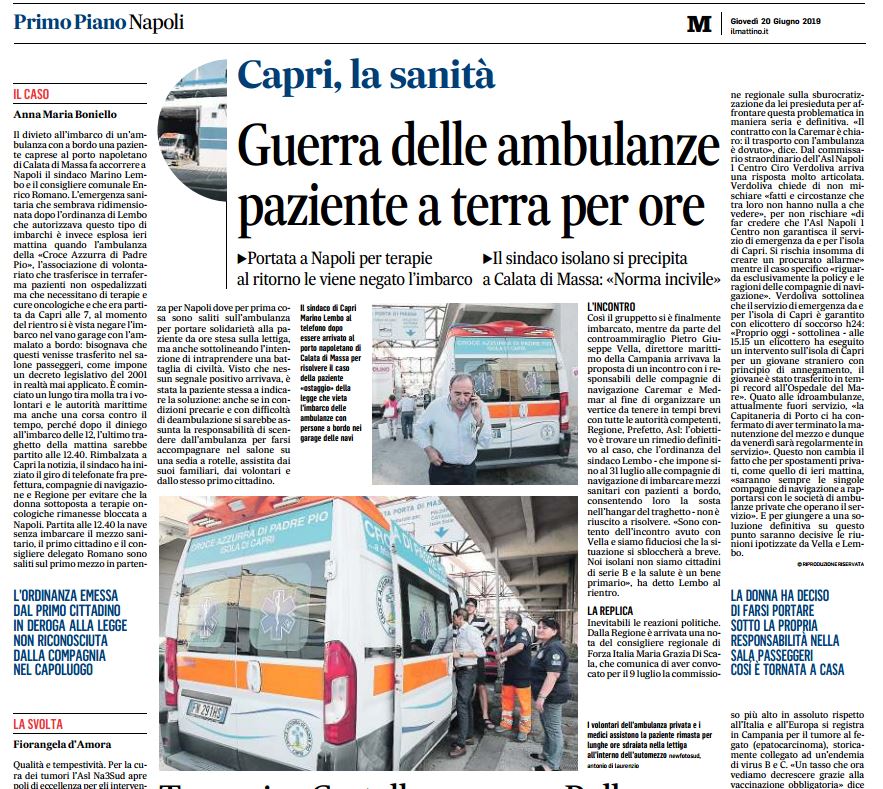 Il divieto all’ imbarco di un’ ambulanza con a bordo una paziente caprese al porto napoletano di Calata di Massa fa accorrere a Napoli il sindaco Marino Lembo e il consigliere comunale Enrico Romano. L’ emergenza sanitaria che sembrava ridimensionata dopo l’ ordinanza di Lembo che autorizzava questo tipo di imbarchi è invece esplosa ieri mattina quando l’ ambulanza della «Croce Azzurra di Padre Pio», l’ associazione di volontariato che trasferisce in terraferma pazienti non ospedalizzati ma che necessitano di terapie e cure oncologiche e che era partita da Capri alle 7, al momento del rientro si è vista negare l’ imbarco nel vano garage con l’ ammalato a bordo: bisognava che questi venisse trasferito nel salone passeggeri, come impone un decreto legislativo del 2001 in realtà mai applicato. È cominciato un lungo tira molla tra i volontari e le autorità marittime ma anche una corsa contro il tempo, perché dopo il diniego all’ imbarco delle 12, l’ ultimo traghetto della mattina sarebbe partito alle 12.40. Rimbalzata a Capri la notizia, il sindaco ha iniziato il giro di telefonate fra prefettura, compagnie di navigazione e Regione per evitare che la donna sottoposta a terapie oncologiche rimanesse bloccata a Napoli. Partita alle 12.40 la nave senza imbarcare il mezzo sanitario, il primo cittadino e il consigliere delegato Romano sono saliti sul primo mezzo in partenza per Napoli dove per prima cosa sono saliti sull’ ambulanza per portare solidarietà alla paziente da ore stesa sulla lettiga, ma anche sottolineando l’ intenzione di intraprendere una battaglia di civiltà. Visto che nessun segnale positivo arrivava, è stata la paziente stessa a indicare la soluzione: anche se in condizioni precarie e con difficoltà di deambulazione si sarebbe assunta la responsabilità di scendere dall’ ambulanza per farsi accompagnare nel salone su una sedia a rotelle, assistita dai suoi familiari, dai volontari e dallo stesso primo cittadino.