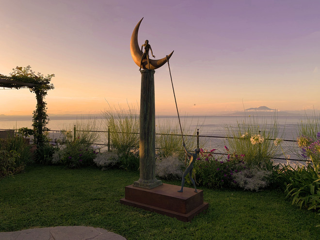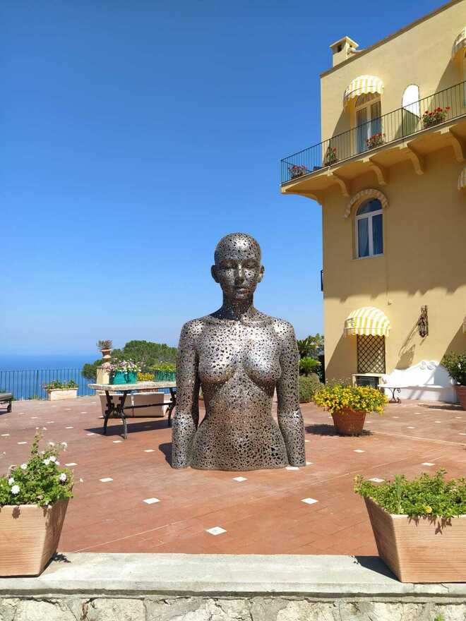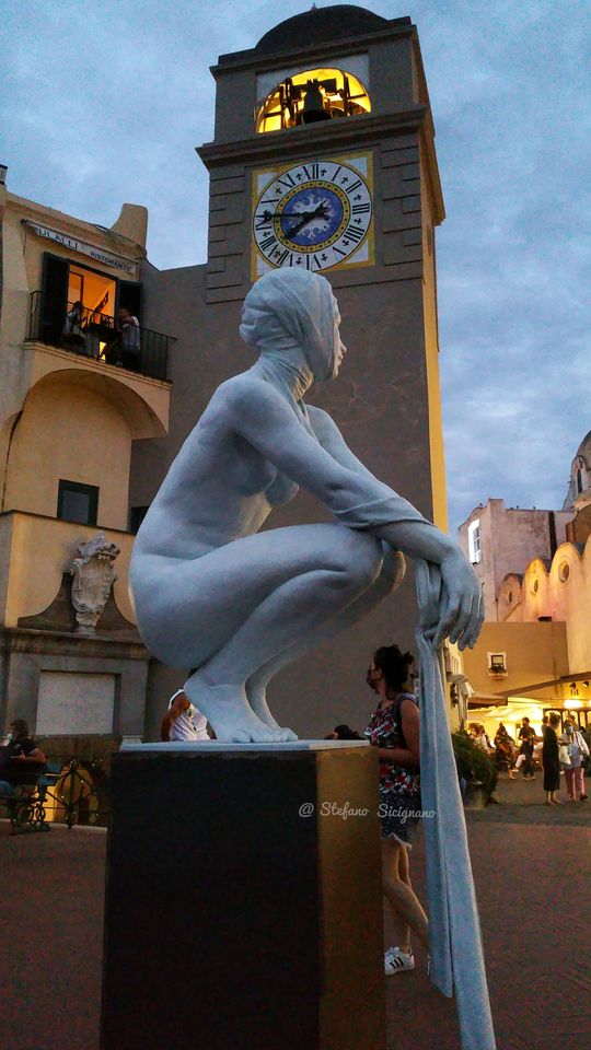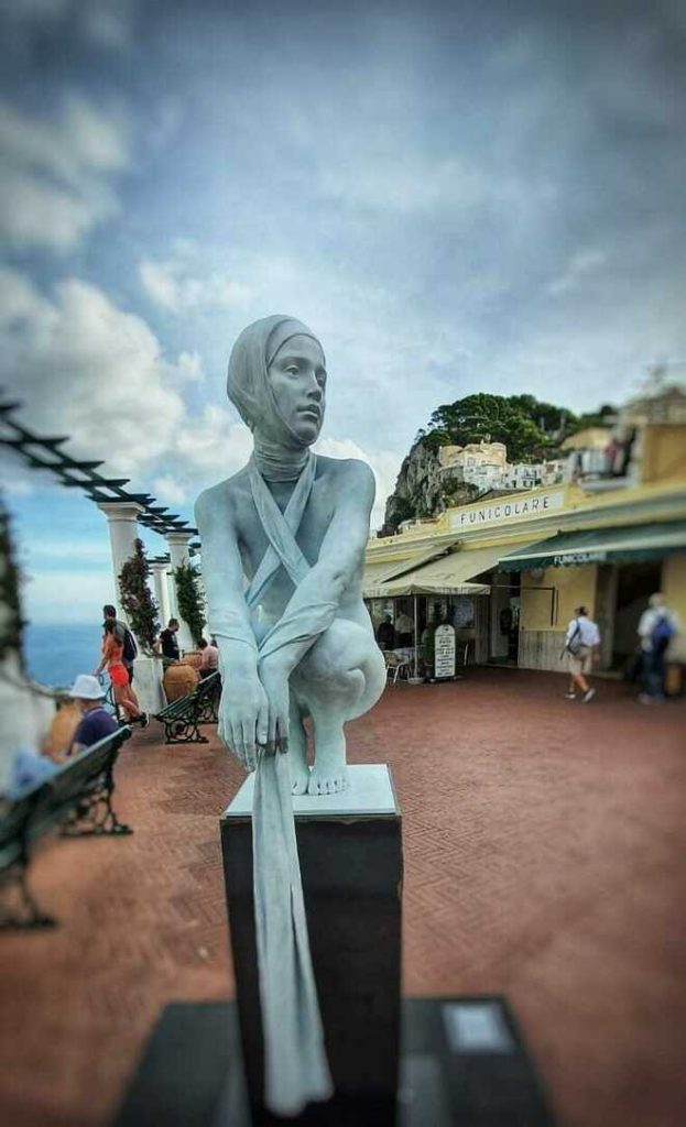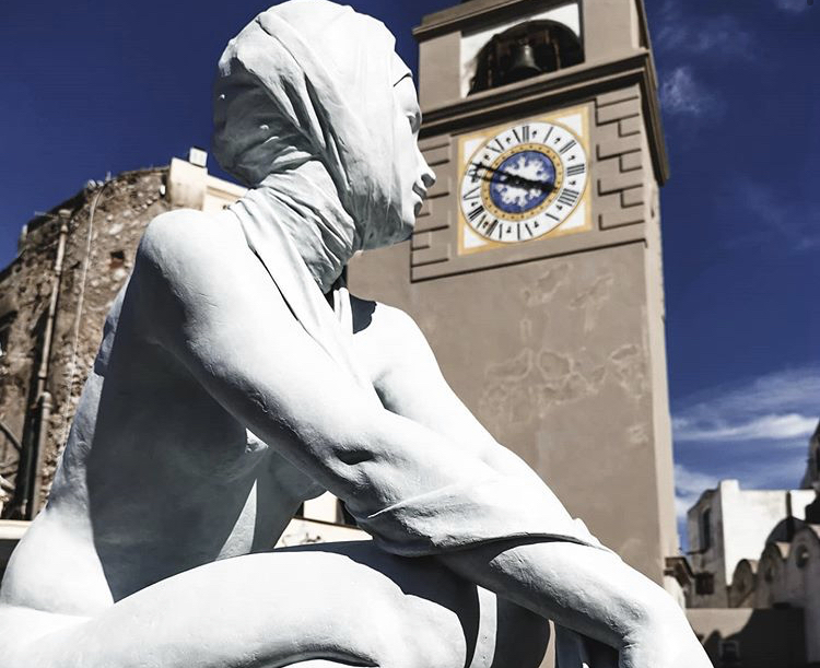 È arrivata solo qualche giorno fa in Piazzetta ma è già un’attrazione, la scultura del duo spagnolo Coderch & Malavia, The tissue of time, posizionata dalla Liquid Art System di Franco Senesi non a caso di fronte la mitica torre dell’orologio. Non è un anno come gli altri per la Piazzetta caprese, abituata ad ospitare viaggiatori di ogni continente e a fare da passerella open air a volti più e meno noti. Il tempo, scandito dal rintocco delle campane , riflette ora nello sguardo assorto dell’opera life size in bronzo : una figura femminile aggraziata che stringe un drappo tra le sue mani. La scultura sembra dare al “salotto del mondo” una nota fiabesca e malinconica: il fazzoletto scivola via tra le mani della fanciulla inesorabile proprio come il tempo. The tissue of time rappresenta al meglio il senso di impermanenza dei nostri giorni ma al tempo stesso la capacità di estraniarsi dal circostante per fare spazio al proprio inconscio. Le sculture di Coderch & Malavia sono accomunate da una profonda analisi psicologica del soggetto ritratto carico di pensieri e desideri. La messa in relazione con il paesaggio caprese fa il resto: la scelta delle installazioni nei luoghi più rappresentativi dell’isola, progetto che portiamo avanti da oltre 5 anni, dichiara il gallerista Senesi , vuole legare la bellezza di Capri al fascino dell’arte, e quindi all’estetica delle opere che proponiamo.” La Liquid Art System anche quest’estate espone open air in diverse location selezionate: hotel di lusso come il Capri Tiberio Palace o il Capri Palace Jumeirah ed il Caesar Augustus ad Anacapri ; lidi panoramici come Da Gemma con l’imponente scultura L’incontro di Gianfranco Meggiato o Il Riccio con un’opera di Paolo Quaresima, ancora all’Hotel Regina Cristina con una creazione di Giacinto Bosco dedicata alla luna caprese. In via vittorio Emanuele proprio all’ingresso della galleria Liquid, spicca Seo Young Deock con una sua opera in catene di acciaio Nirvana e poco più su i Guerrieri di Paolo Staccioli fanno capolino dalla sede di Intesa San Paolo. Un percorso artistico itinerante insolito che sorprende e incanta tutti.