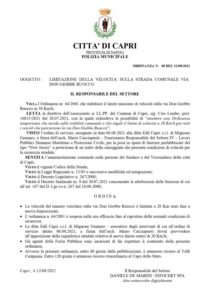 Ordinanza n. 68 del 12.08.2021 – Limitazione della velocità sulla strada comunale via Don Giobbe Ruocco
