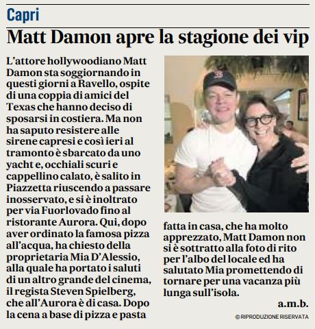 di una coppia di amici del Texas che hanno deciso di sposarsi in costiera. Ma non ha saputo resistere alle sirene capresi e così ieri al tramonto è sbarcato da uno yacht e, occhiali scuri e cappellino calato, è salito in Piazzetta riuscendo a passare inosservato, e si è inoltrato per via Fuorlovado fino al ristorante Aurora. Qui, dopo aver ordinato la famosa pizza all’acqua, ha chiesto della proprietaria Mia D’Alessio, alla quale ha portato i saluti di un altro grande del cinema, il regista Steven Spielberg, che all’Aurora è di casa. Dopo la cena a base di pizza e pasta fatta in casa, che ha molto apprezzato,Matt Damon non si è sottratto alla foto di rito per l’albo del locale ed ha salutato Mia promettendo di tornare per una vacanza più lunga sull’isola.