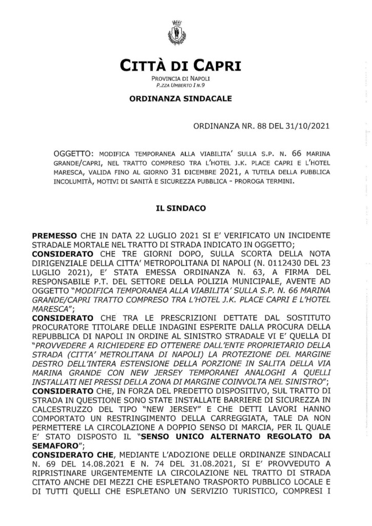 Il sindaco di Capri Marino Lembo ha firmato l’ordinanza di modifica temporanea alla viabilità sulla Strada Provinciale n.66 tra l’Hotel J.K. Place Capri e l’Hotel Maresca, valida fino al 31 dicembre a tutela della pubblica incolumità. Il tratto di strada in questione è quello che il 22 luglio scorso fu teatro del tragico incidente che costò la vita al conducente dell’ATC Emanuele Melillo.