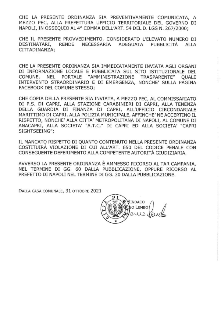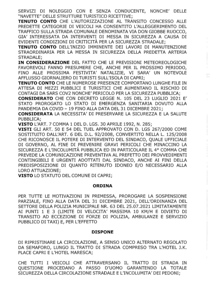 L’ordinanza dispone di ripristinare la circolazione a senso unico alternato regolato da semaforo ed il transito del veicoli a passo d’uomo e si è resa necessaria in vista di un probabile notevole afflusso di turisti previsti da oggi alle festività natalizie che comporteranno la necessità di rispondere all’aumento della richiesta di mobilità per smaltire le previste lunghe file di attesa e quindi anche per la necessità di dover garantire il rispetto delle norme anti covid, vista anche la proroga dell’emergenza sanitaria fino alla fine dell’anno.