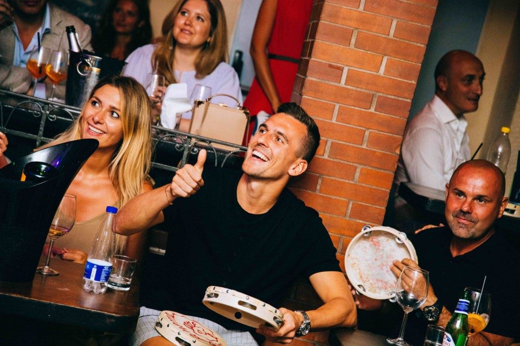 Tavolo a centro pista per Milik che è stato omaggiato della bottiglia e dei tamburelli personalizzati con foto insieme alla moglie Jessica Ziolek. Serata romantica per la coppia con il sottofondo di Gianluigi Lembo e dell’Anema e Core band.