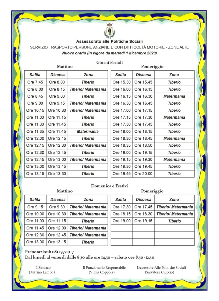 Il Sindaco, Marino Lembo, e l’Assessore alle Politiche Sociali, Salvatore Ciuccio, comunicano i nuovi orari per il servizio trasporto sociale per le zone alte di Capri. Grazie ai due nuovi carrelli che hanno portato la dotazione del parco macchine a cinque, è stato possibile aumentare il numero delle corse sia per Tiberio che per Matermania.