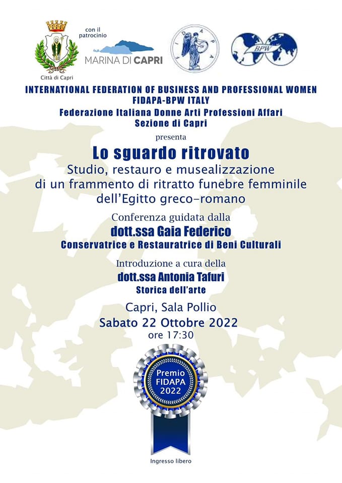 Premio Fidapa 2022 che si terra’ oggi presso la Sala Pollio della Citta’ di Capri. Il Premio verra’ riconosciuto alla dott.ssa Gaia Federico, Conservatrice e Restauratrice di Beni Culturali, che guidera’ la Conferenza sullo studio, il restauro e la musealizzazione di un tratto funebre femminile dell’Egitto greco-romano. Introdurra’ la dott.ssa Antonia Tafuri, storica dell’arte.