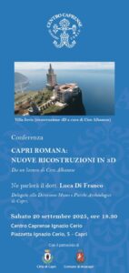 Sabato 20 settembre alle ore 18.30 il Centro Caprense Ignazio Cerio ospiterà la conferenza “Capri romana: nuove ricostruzioni in 3D”: Villa Jovis, Palazzo a Mare, Gradola, Damecuta tornano a vivere grazie alle più recenti tecnologie e agli studi archeologici.