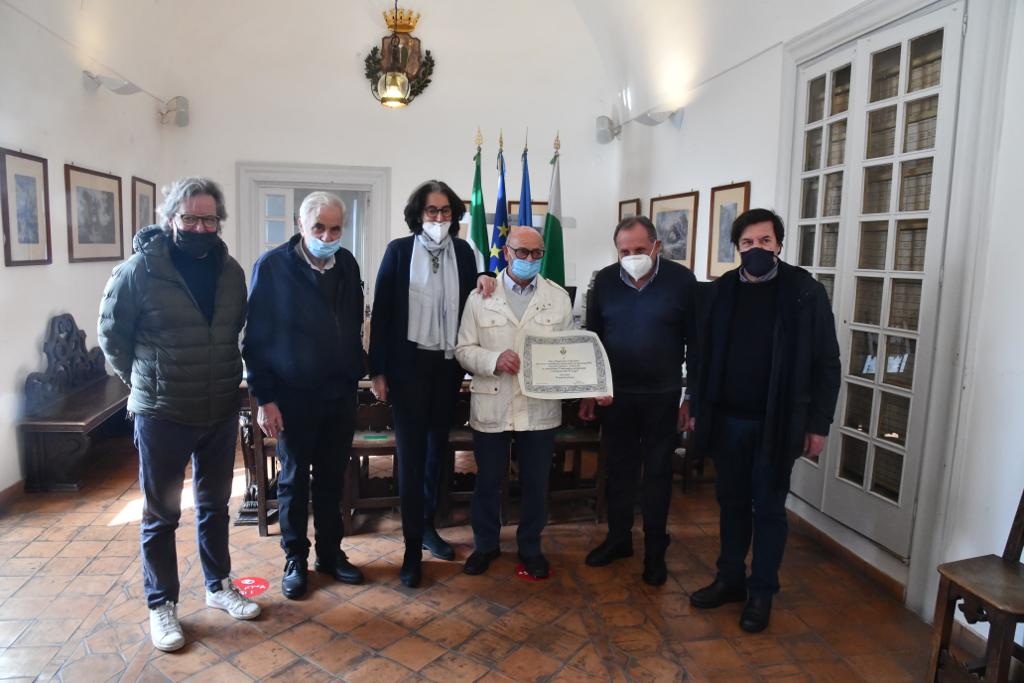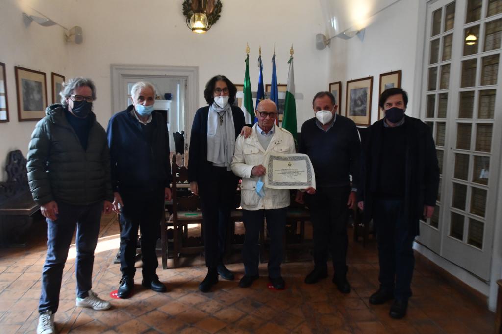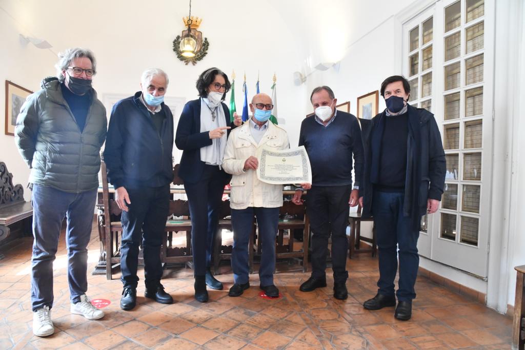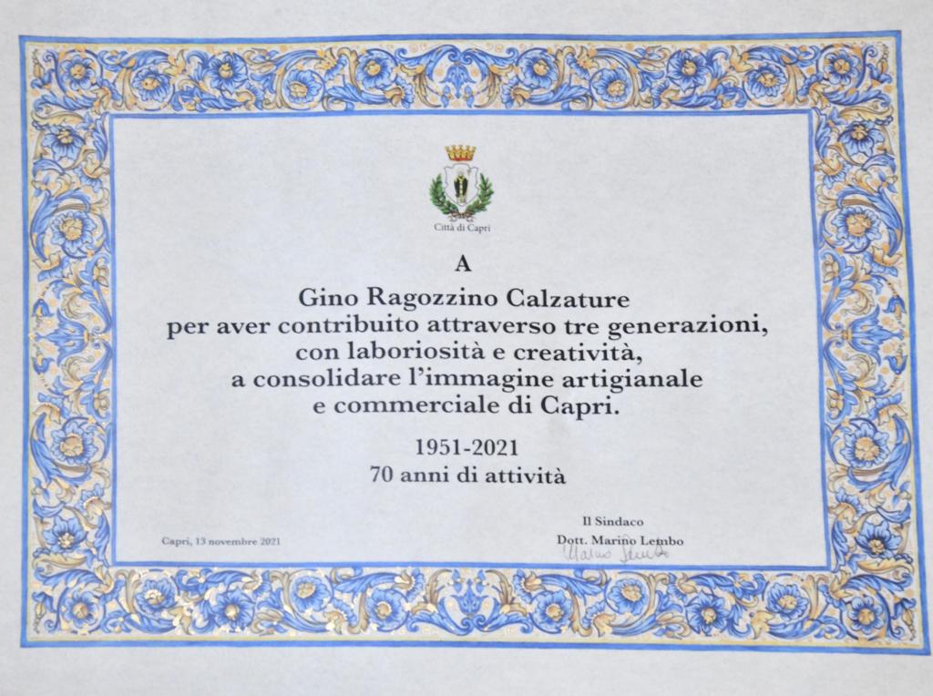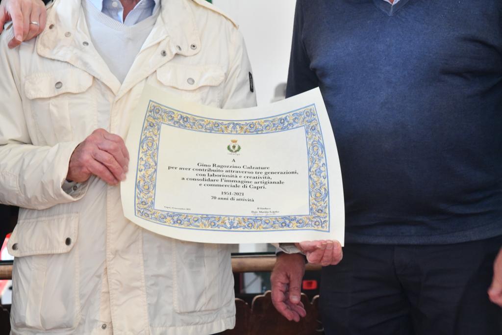 Artigianato caprese e tradizioni e questo è stato il concept della cerimonia che si è tenuta oggi nella sala consiliare del comune di Capri dove il sindaco Marino Lembo con il vicesindaco Ciro Lembo e una rappresentanza della giunta comunale unitamente al presidente dei commercianti Luciano Bersani per la consegna della pergamena a Gino Ragozzino, storico titolare di una boutique artigianale di sandali e scarpe made in Capri che ha aperto i battenti nel 1951 e che oggi celebra i suoi 70 anni di attività. Tale percorso è ricordato sulla pergamena con lo scritto “Città di Capri a Gino Ragozzino Calzature per aver contribuito attraverso tre generazioni, con laboriosità e creatività, a consolidare l’immagine artigianale e commerciale di Capri. 1951–2021 70 anni di attività».