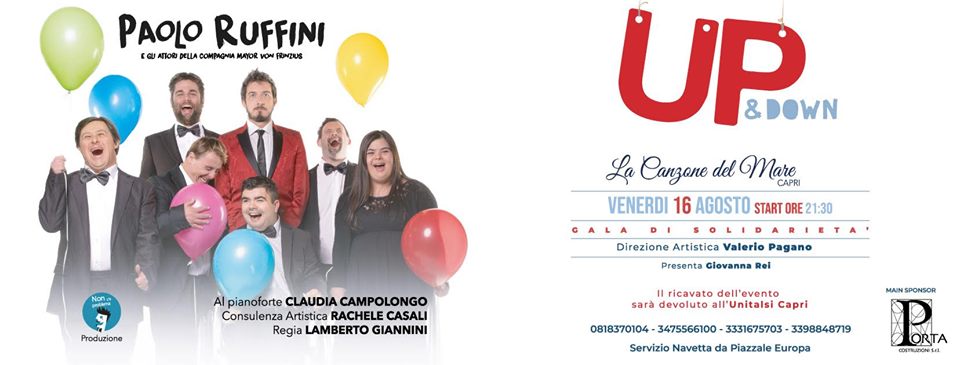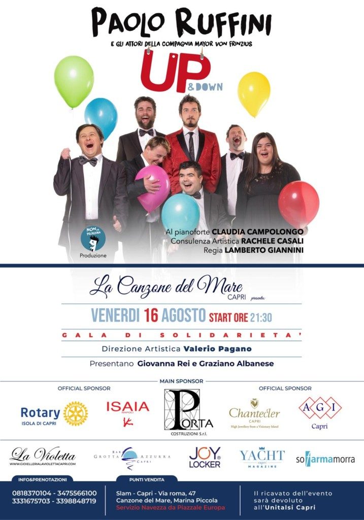 Sulla scia del successo dello scorso anno la Power Up Capri presenta un nuovo live show in una delle location più suggestive dell’isola: la Canzone del Mare. La quinta en plein air sulla storica piscina di Marina Piccola che si affaccia davanti ai Faraglioni, simbolo della Dolce Vita caprese degli anni 50-60, regalerà un emozionante show anche quest’anno. Dopo il grande clamore dello spettacolo di Pio e Amedeo “Tutto fa Broadway” della scorsa estate, la Power Up di Valerio Pagano con la partnership di Porta Costruzioni presenta quest’anno un evento unico, nello scenario mozzafiato della baia dei Faraglioni: UP&DOWN, con la regia di Paolo Ruffini. Uno spettacolo, all’insegna della solidarietà che farà ridere, emozionare e commuovere, condotto da Giovanna Rei e Graziano Albanese e il cui intero ricavato sarà devoluto all’UNITALSI di Capri.