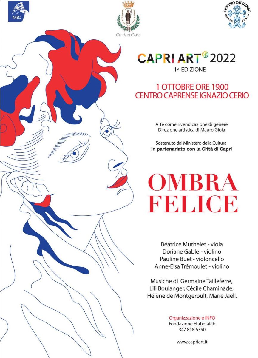 In programma musiche come il Quatuor di Germaine Tailleferre, unica donna a far parte del Gruppo dei Sei, Lili Boulanger, morta a soli 26 anni lasciando pagine di musica eccezionalmente matura, l’Opus 3 pour piano di Hélène de Montgeroult, una delle più grandi pianiste della sua epoca con una carriera penalizzata dalle sue origini aristocratiche, la Danse Creole di Cécile Chaminade, prima compositrice a ricevere la Légion d’Honneur e Quatuor à cordes di Marie Jaëll, che più di tutte riuscì a imporsi. Così, grazie al quartetto Ombra Felice e all’impegno di CapriArt*, la causa delle donne in musica prende forma attraverso le loro note.