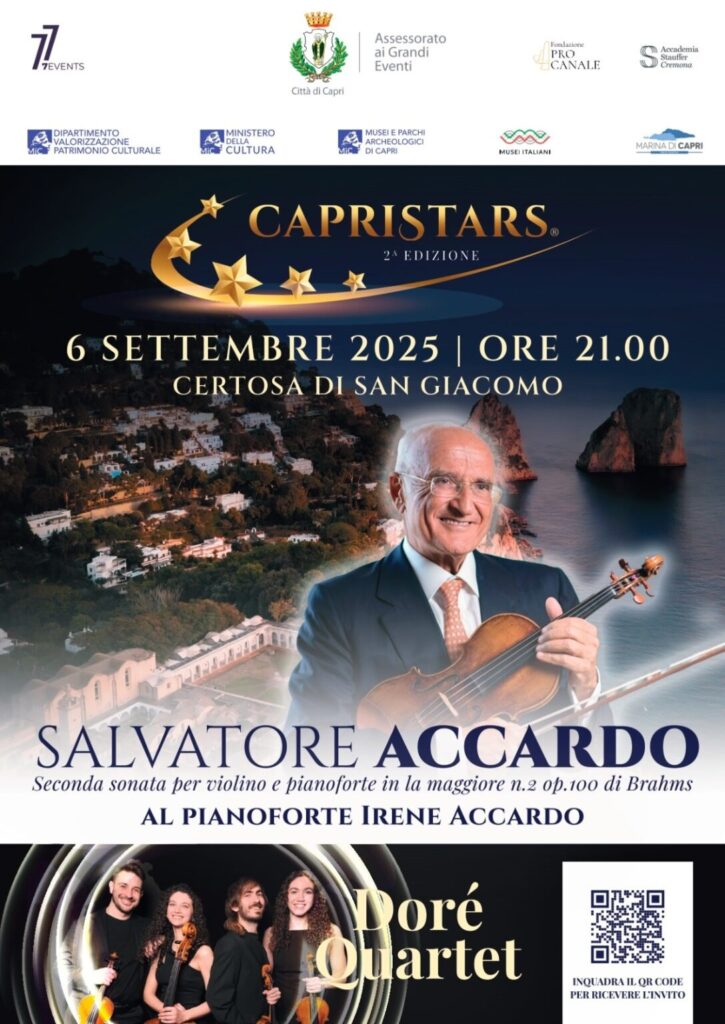 “Tra i principali appuntamenti della stagione turistica caprese, la seconda edizione di “Capristars” sarà interamente dedicata al Maestro Salvatore Accardo, autentica eccellenza della musica classica, che regalerà al pubblico presente sull’Isola un’esibizione di grande intensità, pensata per attrarre visitatori sia dall’Italia sia dall’estero.” come sottolinea Salvatore Ciuccio, Assessore ai Grandi Eventi del Comune di Capri. ”A dare il benvenuto agli ospiti saranno tre giovani musicisti capresi, impegnati nello studio del violino, le cui performance arricchiranno la serata nella suggestiva cornice storica e culturale della Certosa di San Giacomo. Il cartellone degli eventi di quest’anno – conclude l’assessore – è stato progettato con l’obiettivo di ampliare e diversificare l’offerta culturale della città, così da rivolgersi a un pubblico variegato e intergenerazionale.”