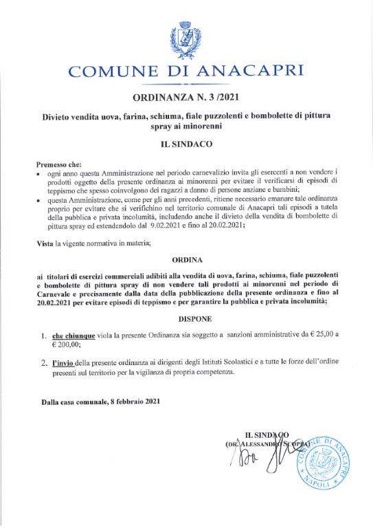 Carnevale, ad Anacapri divieto di vendita di uova farina e schiuma ai minori
