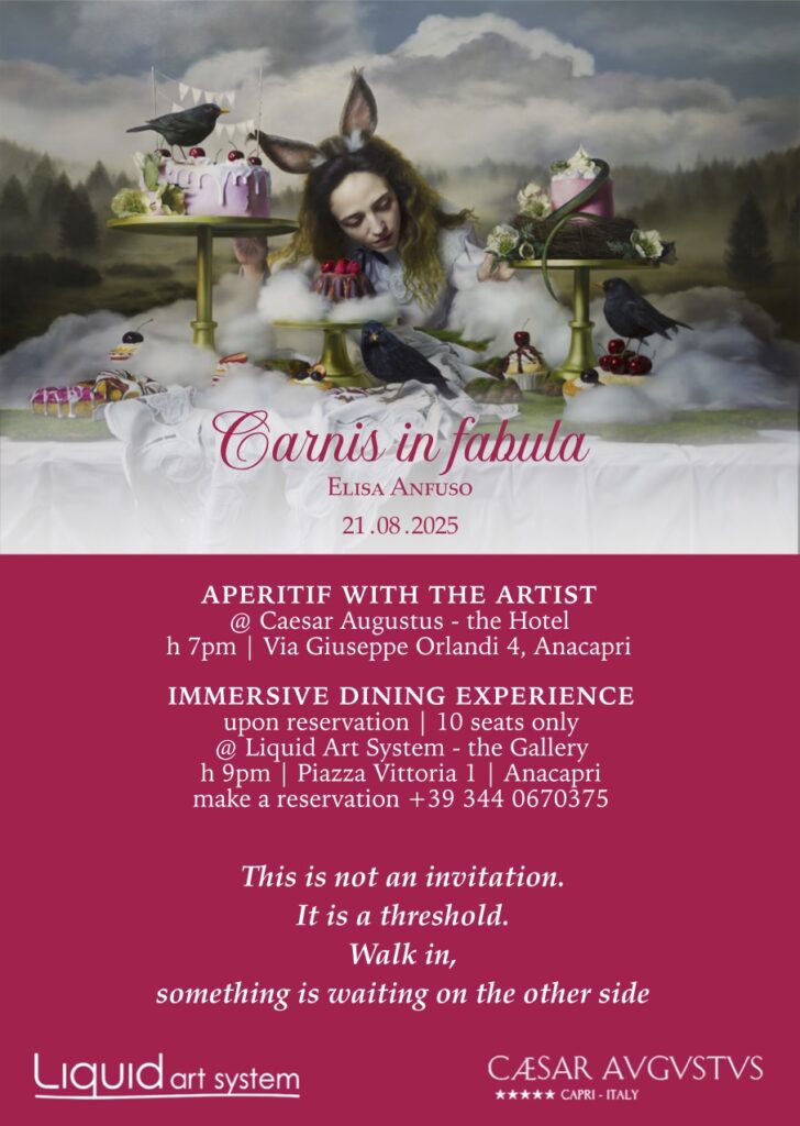 Un‘esperienza tra arte e suggestione sensoriale: con “Carnis in Fabula”, serata dedicata all‘artista siciliana Elisa Anfuso, giovedì 21 agosto si inaugura un nuovo ciclo di eventi frutto della collaborazione tra Liquid Art System e l‘Hotel Caesar Augustus di Anacapri.