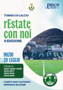 Seconda edizione del Torneo di Calcio “rEstate con noi” patrocinato dal Comune di Capri in collaborazione con l’Asd Germano Bladier Caprese. Anche in questa stagione il torneo, aperto a tutti, sarà diviso in quattro distinte categorie in modo da poter coinvolgere il più alto numero di ragazzi possibilie. In campo 2007/2008/2009, 2010/2011, 2012/2013 e 2014/2015. Per info contattare Diego Amato 347 405 6801 o Enzo Scarfato 339 753 9533.