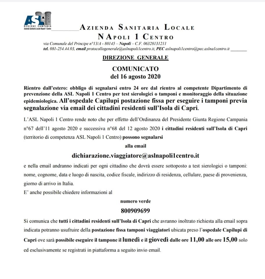Il Comune di Capri ha pubblicato sulla pagina istituzionale facebook la comunicazione dell’ASL 1 Napoli Centro con gli adempimenti per i controlli anti covid da seguire per i cittadini di Capri che rientrano dall’estero