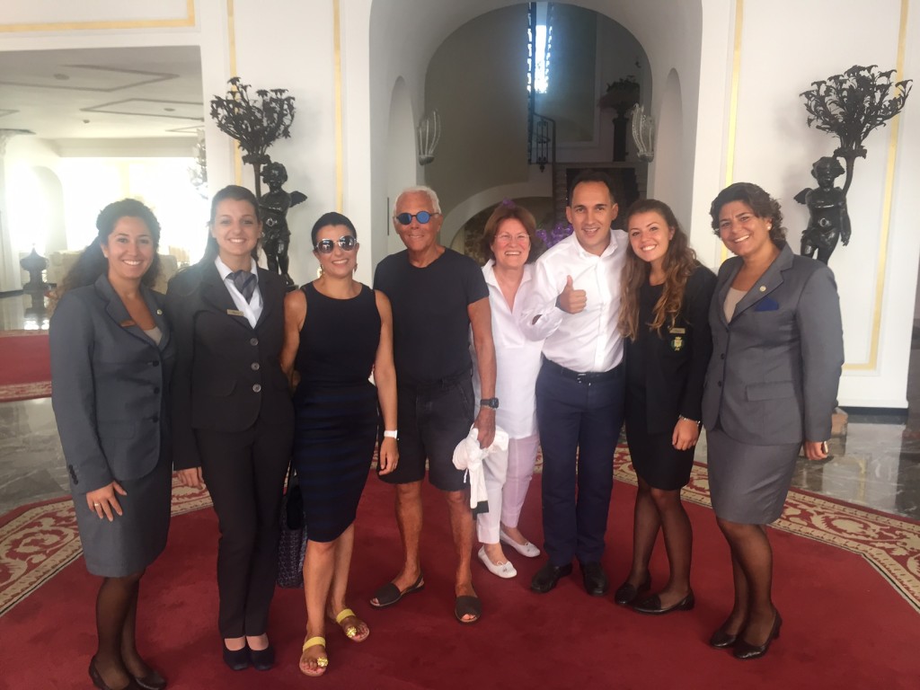 Giorgio Armani, puntuale come ogni fine estate, ha ormeggiato il Maìn, il suo yacht, nella baia di Marina Grande, e all’ ora del caffè mattutino ha attraversato la piazzetta per sedersi con i suoi amici alla terrazza bar del Grand Hotel Quisisana, location che Armani predilige trovandosi proprio di fronte alla sua elegantissima boutique di Via Camerelle. Circa un’ ora insieme agli amici, una foto ricordo con Carmen, Lucia Morgano e suo figlio Adalberto amici del re della moda, e proprietari dell’ albergo che quest’ estate è stato scelto da Armani per una serata esclusiva per soli cento ospiti per il «reveal» della borsa Le Sac 11 dedicata a Capri. Giorgio Armani e il suo gruppo di amici, dopo il caffè in terrazza, sono ritornati a bordo dello yacht classificato come il più lussuoso ed elegante al mondo, costruito nei cantieri viareggini di Codecasa, con gli interni curati personalmente da Armani.