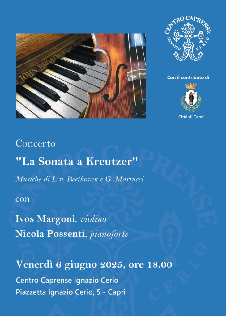 Venerdì 6 Giugno alle ore 18 il Centro Caprense I. Cerio ospiterà il Concerto “La Sonata a Kreutzer” , musiche di Beethoven e Martucci, eseguite da Ivos Margoni ( violino) e Nicola Possenti ( pianoforte).