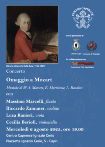 Mercoledì 6 agosto, ore 19:00, il Centro Caprense Ignazio Cerio ospiterà il Concerto: “Omaggio a Mozart”. Massimo Mercelli flautista di fama internazionale si esibirà con Riccardo Zamuner al violino, Luca Ranieri alla viola e Cecilia Berioli al violoncello. L’evento, patrocinato dalla Città di Capri e dal Comune di Anacapri, si terrà in collaborazione con la Fondazione Franco Michele Napolitano. Verranno eseguite le partiture di Wolfgang Amadeus Mozart, Ennio Morricone e Luis Bacalov.