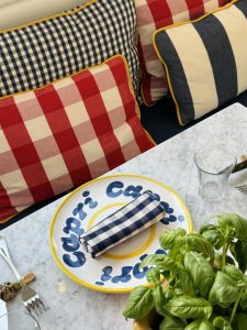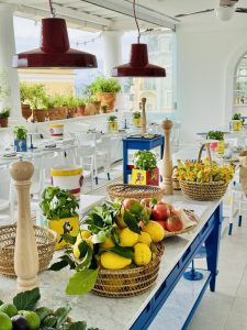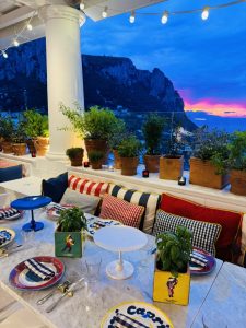Concettina ai Tre Santi non è solo una pizzeria, è un progetto che integra gusto, ricerca costante e life style in un’offerta unica e inimitabile fatta di sapori indelebili, di gesti e piccoli rituali, di oggetti cult come gli iconici piatti in ceramica vietrese disegnati su misura. Un condensato di storia e passione verace, con radici ben salde nella tradizione napoletana e occhi guizzanti sul futuro. E mo’ e mo’, da un’immortale canzone di Peppino di Capri, è il mood che quest’anno accompagna l’apertura e la stagione 2025 che aggiunge anche un’offerta cocktail con miscelazioni preparate direttamente al tavolo dal bartender e in pairing perfetto con le pizze. I colori gioiosi e mediterranei, le sedie da osteria in legno laccato bianco, i cuscini variopinti, le piantine di basilico su ogni tavolo accolgono come a casa e la terrazza, con le tipiche colonne bianche dell’architettura storica caprese, incanta per il panorama che spazia dal mare all’antico campanile della piazzetta.