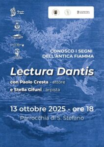 Tra gli appuntamenti più attesi , lunedì 13 alle ore 18, presso la Chiesa di Santo Stefano un sentito momento performativo: la Lectura Dantis affidata alla voce dell’attore Paolo Cresta, accompagnato all’arpa da Stella Gifuni. Un evento aperto alla comunità isolana, che restituisce la potenza evocativa del testo dantesco in un luogo pregno di spiritualità.
