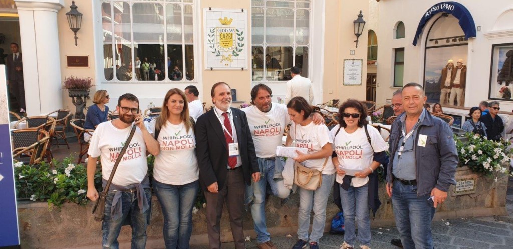 Presidio di lavoratori Whirlpool contro la cessione del sito di Napoli anche a Capri per attirare l’attenzione dei circa 2.000 tra ospiti relatori e partecipanti al tradizionale convegno dei giovani di Confindustria. Con un volantinaggio discreto i lavoratori hanno dunque ribadito come lla scelta della multinazionale americana del bianco sia «una decisione esclusivamente politica e di bilancio». «La vertenza è nelle mani del presidente del Consiglio, che deve pretendere il rispetto degli accordi e delle istituzioni, alle multinazionali, come lo pretende da tutti», dicono i lavoratori che chiedono «uno sforzo e una spinta corale a tutta l’imprenditoria perché difendere Whirlpool a Napoli significa difendere il lavoro al Sud e lo sviluppo in Italia». Un appello che Confindustria raccoglie senza esitazione: «il domani di Whirlpool e dei suoi 400 famiglie sono una pagina di storia italiana e non di cronaca locale. Per questo siamo pronti a metterci al lavoro con il Governo per trovare subito soluzioni concrete e di lungo periodo», risponde dal palco il presidente dei giovani imprenditori di Confindustria, Alessio Rossi.