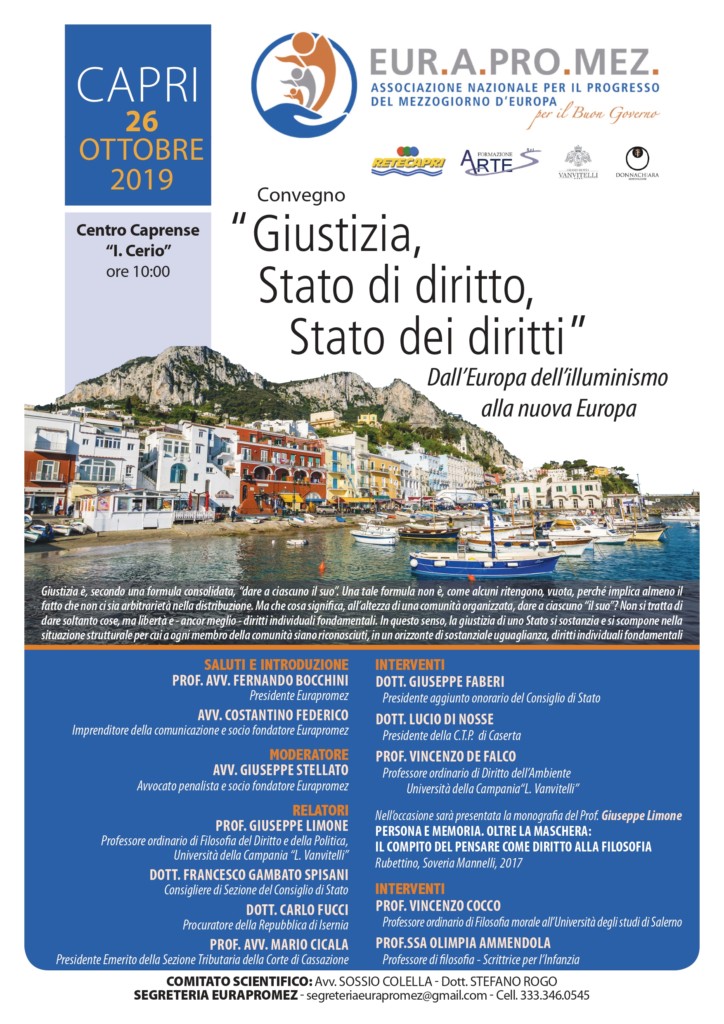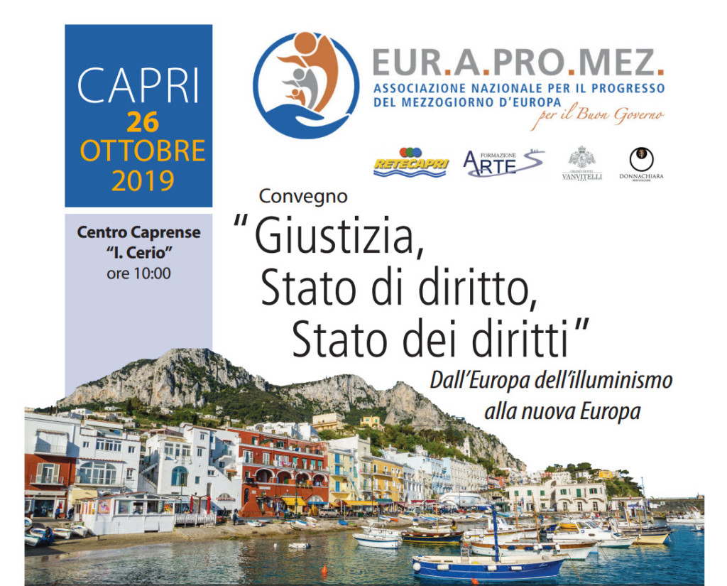 Si terrà nell’ultimo week end di ottobre a Capri la quattordicesima edizione dell’annuale Convegno PRO.MEZ, l’Associazione Nazionale per il Progresso del Mezzogiorno d’Europa, organizzato dall’emittente Retecapri. L’associazione vede tra i soci fondatori Costantino Federico. Il convegno si terrà sabato 26 ottobre a partire dalle ore 10.00 nell’aula del Centro Caprense Ignazio Cerio. Il tema di quest’anno è centrato su “Giustizia, Stato di diritto, Stato dei diritti. dall’Europa dell’illuminismo alla nuova Europa”. Numerosi ed importanti i temi saranno trattati così come numerosa sarà in questa edizione la presenza di qualificati esponenti del mondo politico, industriale e giudiziario. Il convegno sarà introdotto dal prof. avvocato Fernando Bocchini, Presidente EUR.A.PRO.MEZ e dall’avvocato Costantino Federico, imprenditore della comunicazione e socio fondatore EUR.A.PRO.MEZ. A moderare il meeting e il dibattito che vede la presenza di illustri giuristi, rappresentanti del mondo universitario e rappresentanti delle Istituzioni giuridiche sarà Giuseppe Stellato, avvocato penalista e socio fondatore EUR.A.PRO.MEZ.