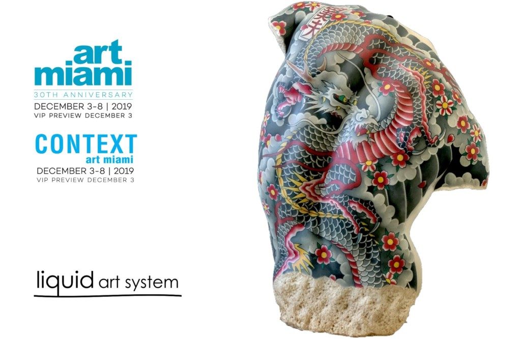 Ad Art Miami, Liquid art system esporrà solo artisti italiani, testimoni della scena figurativa italiana, nei dipinti e nelle sculture, interpretata in chiave marcatamente contemporanea. Gli artisti in mostra saranno: Agostino Arrivabene e Roberto Ferri, entrambi noti nomi della nostrana pittura; Elisa Anfuso, di recente protagonista di un solo show al MaGa ( Gallarate) con le sue donne sognanti ed atmosfere fiabesche, Paolo Quaresima, con il suo iperrealismo simbolista. Le sculture saranno ad opera di Gianfranco Meggiato, con i suoi bronzi intrecciati, e Fabio Viale, new entry nella scuderia della Liquid Art System. L’artista, attualmente in mostra alla Biennale di Venezia nel padiglione Venezia, è grado di rendere il marmo morbido o flessibile come la gomma, dando vita ad opere che, con un’inevitabile sguardo al passato, si caratterizzano per la loro spiccata modernità. Il numero di stand sarà AM532.