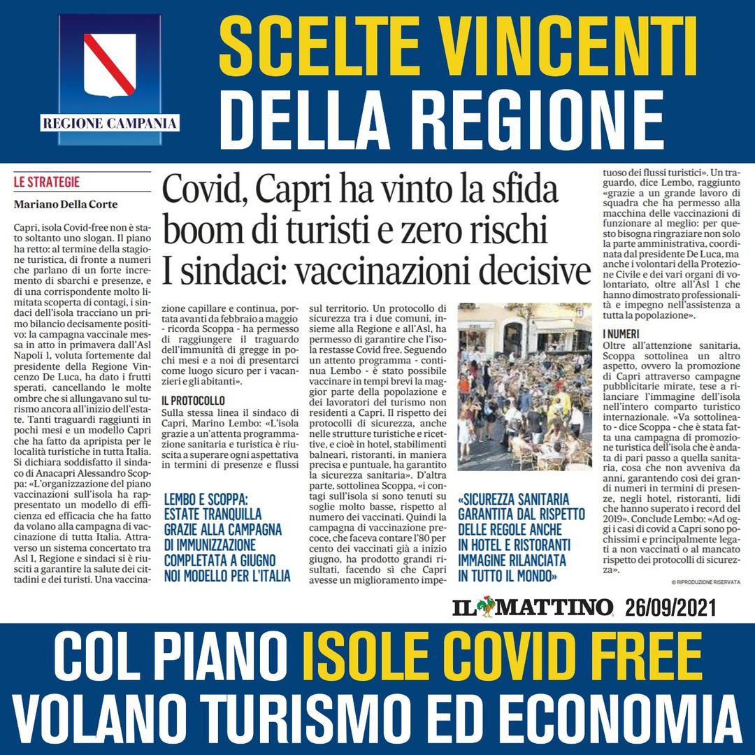 Grazie alla campagna vaccinazioni Covid-free voluta dalla Regione Campania, Capri, come pure Ischia, Procida e le altre destinazioni turistiche regionali, hanno avuto un grande beneficio in termini di arrivi e di ripresa economica. A dimostrazione che vaccinarsi tutti è il principale strumento che abbiamo a disposizione per tutelare la nostra salute, tornare alla vita normale, far crescere la nostra economia e creare lavoro.