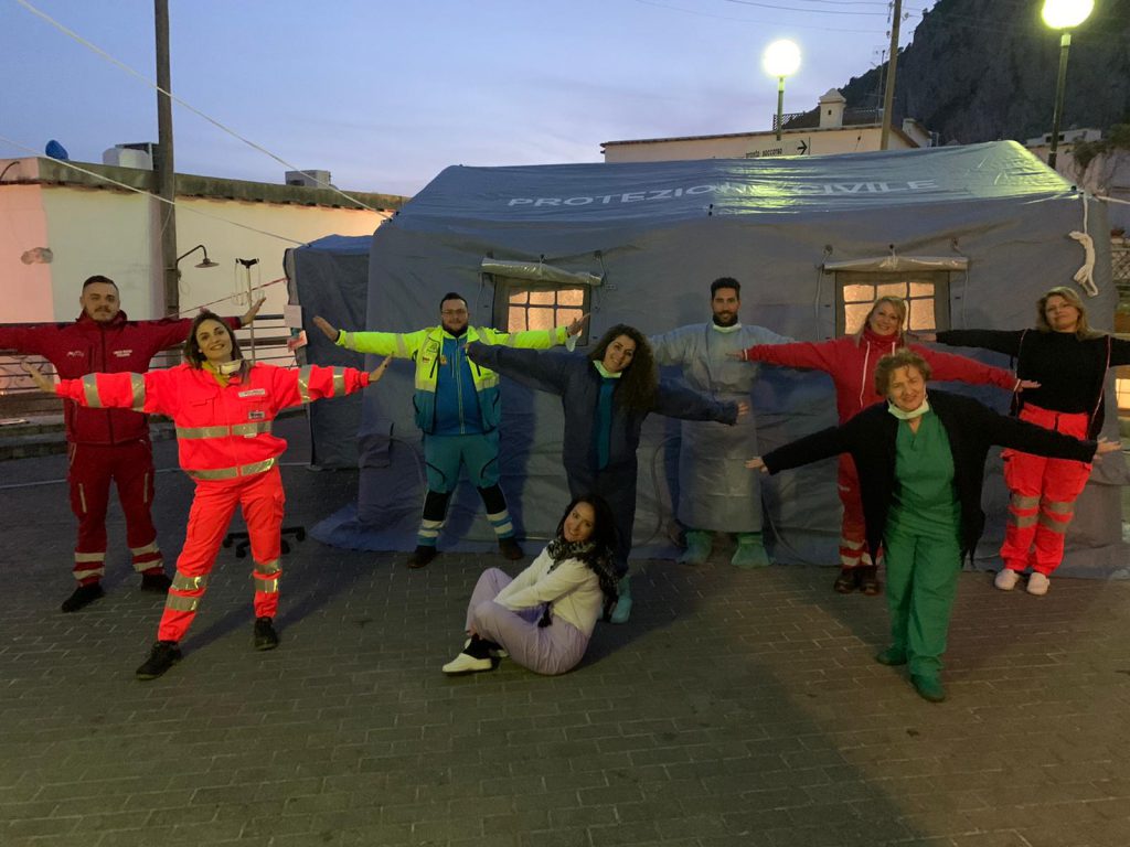 Non si smorzano l’entusiasmo e la solidarietà del team di medici, infermieri, autisti di autoambulanze tecnici ed operatori socio-sanitari che opera all’ospedale Capilupi di Capri, unico nosocomio dell’isola azzurra. Anche in questi giorni di emergenza da Covid-19, il personale medico continua ad assicurare, spesso in condizioni non semplici e sopratutto con turni lavorativi molto lunghi e faticosi, il servizio sanitario sull’isola. Eppure, nonostante la stanchezza, il gruppo ha voluto lanciare, tramite un flashmob sul piazzale esterno dell’ospedale, un messaggio di speranza e vicinanza umana, oltre che professionale, agli abitanti di tutta l’isola. Un abbraccio simbolico, il loro, che pur mantenendo le distanze previste dai recenti decreti atti a contenere la diffusione del nuovo Coronavirus, che tanta preoccupazione sta causando da Nord a Sud dello stivale italiano, vuole trasmettere calore, fiducia e sicurezza.
