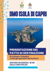 Giovedì 26 Marzo alle ore 16,30 presso la Sala “L. Pollio” di Capri ci sarà la presentazione alla cittadinanza del Patto di Destinazione della “DMO Isola di Capri”, strumento strategico per la costruzione di una visione condivisa e sostenibile del turismo a Capri. Nel corso dell’incontro saranno illustrati obiettivi, modalità operative e opportunità legate alla costituzione della DMO Isola di Capri di cui si chiederà il riconoscimento provvisorio da parte della Regione Campania. All’iniziativa prenderanno parte i Sindaci dei Comuni di Capri e Anacapri, le principali associazioni di categoria e tutti gli operatori del turismo dell’isola. L’adesione al Patto di Destinazione avverrà attraverso la sottoscrizione formale da parte dei soggetti interessati. La relativa documentazione e le modalità di adesione saranno resi disponibili in occasione dell’incontro.