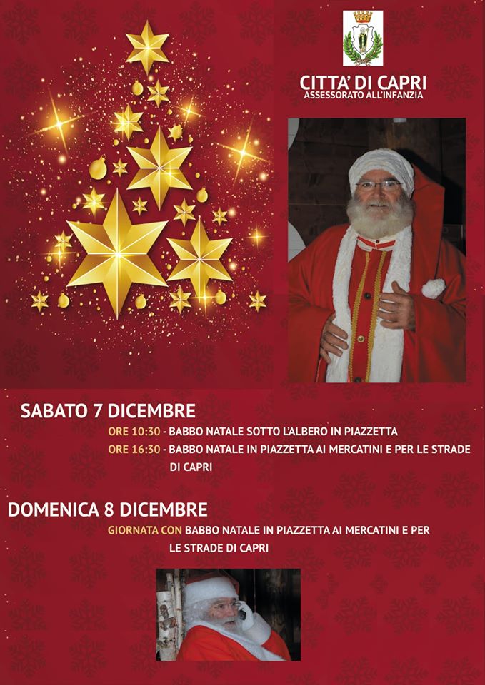 In Piazzetta a Capri arriva Babbo Natale! Oggi e domani in Piazzetta a Capri arriva Babbo Natale per accogliere, sotto l’Albero, i bimbi per le foto e le letterine con caramelle e popcorn. L’iniziativa è stata annunciata dal Sindaco Marino Lembo e dall’Assessore all’Infanzia Salvatore Ciuccio e rientra nel programma degli eventi che animeranno i mercatini di Natale.