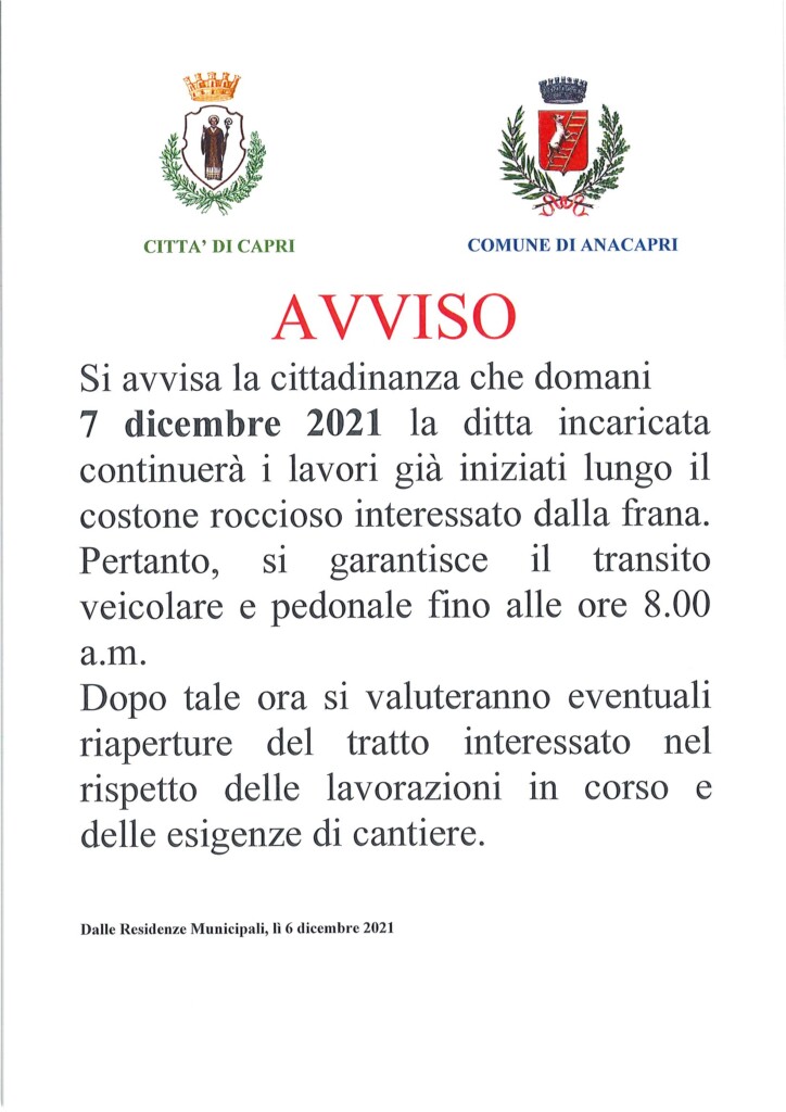 Domani dalle ore 8:00 chiude la strada provinciale Capri – Anacapri per la messa in sicurezza