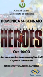 Domenica 14 Gennaio, la Città di Capri, Assessorato all’Infanzia nella persona del dott. Salvatore Ciuccio, e la Capri Spettacoli presentano “Heroes Event”, l’evento, che fa parte del cartellone di eventi natalizie dell’assessorato, si doveva svolgere il 7 Gennaio, ma a causa delle avverse condizioni meteo è stato spostato al 14 Gennaio.