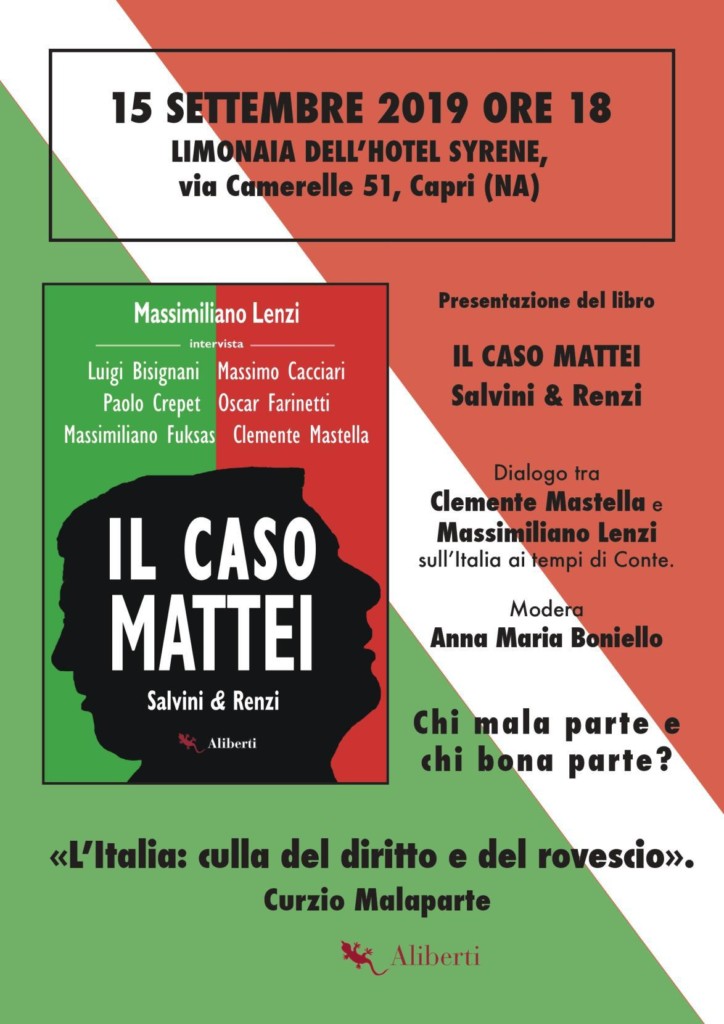 Domenica 15 Settembre alle ore 18 nella Limonaia dell’Hotel Syrene a Capri è in programma la presentazione del libro “I casi Mattei” con un dialogo fra Clemente Mastella e l’autore del libro, il giornalista Massimiliano Lenzi