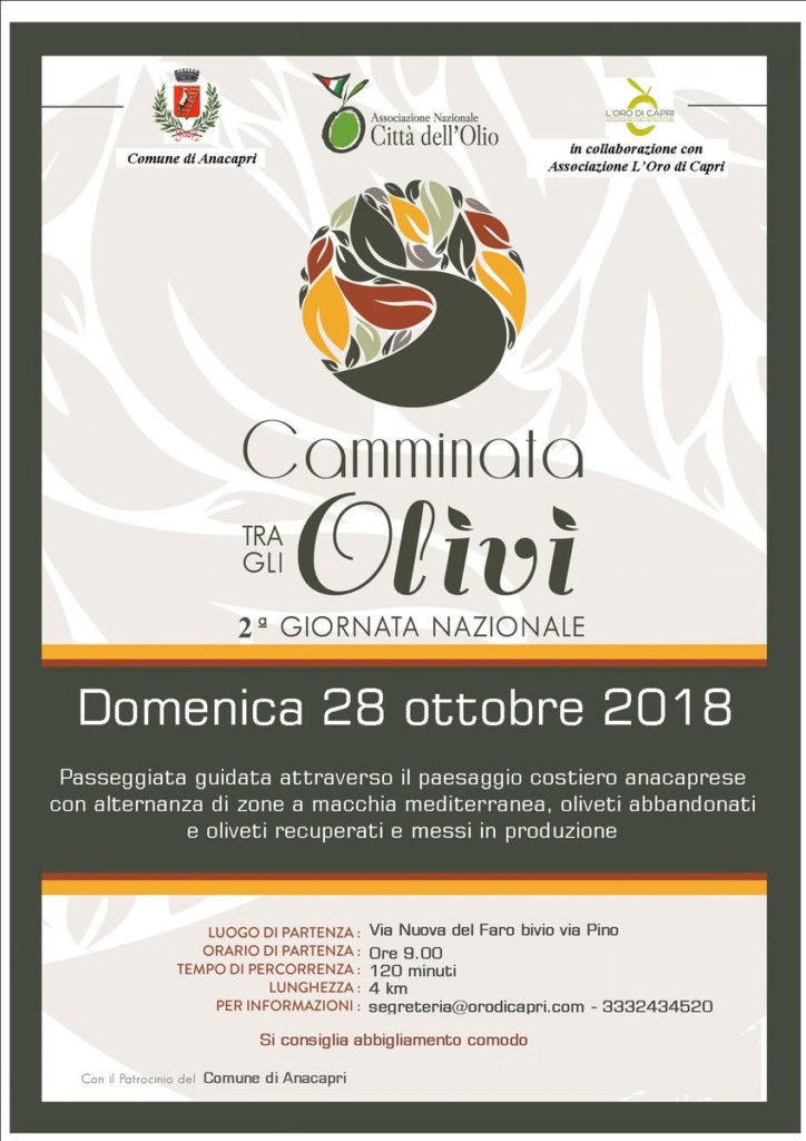 Domenica 28 Ottobre, in occasione della seconda Giornata Nazionale “Camminata tra gli olivi”, organizzata dal comune di Anacapri che è stato inserito tra le “Città dell’Olio” in collaborazione con l’Associazione “L’Oro di Capri”, si terrà la seconda “camminata tra gli olivi”, lungo il sentiero storico dei Fortini.