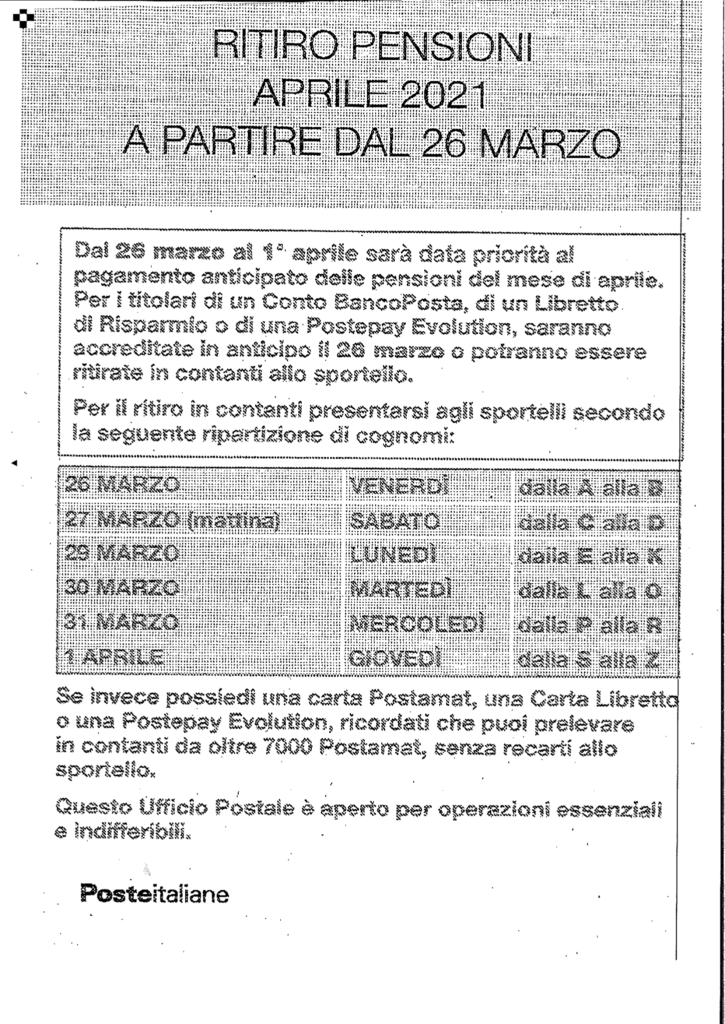 Poste SPA ha inviato la comunicazione relativa al pagamento delle pensioni di aprile