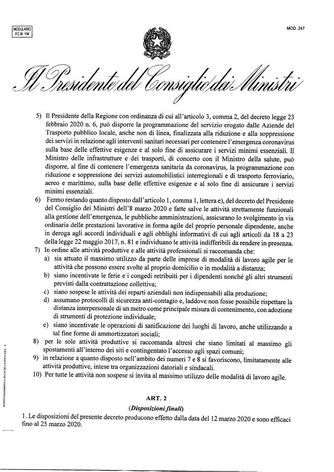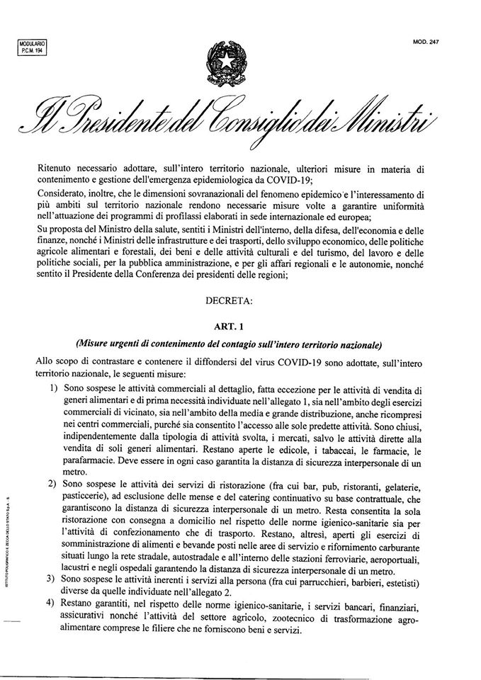 Pubblichiamo di seguito il decreto della Presidenza del Consiglio dei Ministri del 11 marzo 2020 con le nuove “Misure urgenti per il contenimento dell’epidemia covid-19”, che decreta la sospensione delle attività commerciali con l’esclusione dei punti vendita di alimentari ed altre attività ritenute essenziali.
