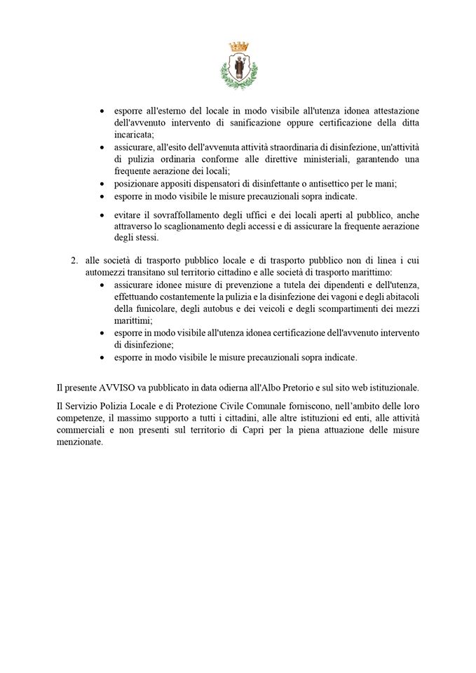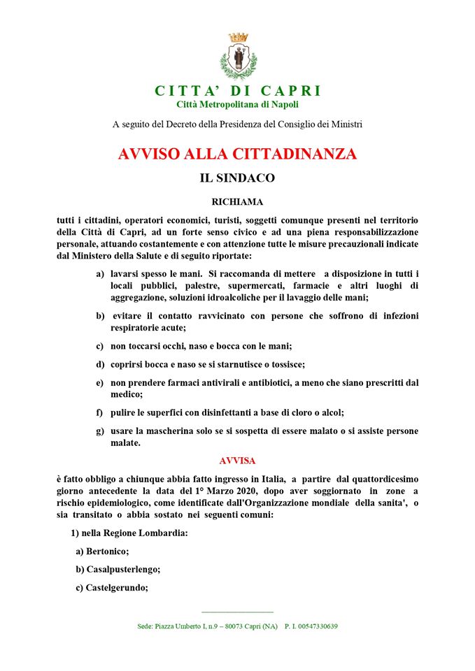 Prevenzione coronavirus: il Comune di Capri indica le misure precauzionali