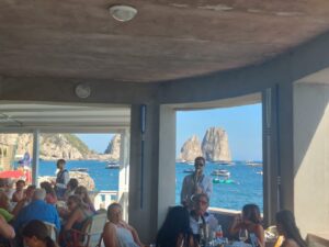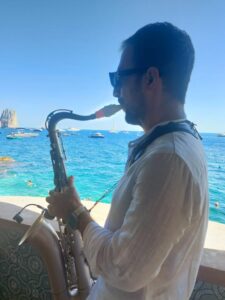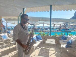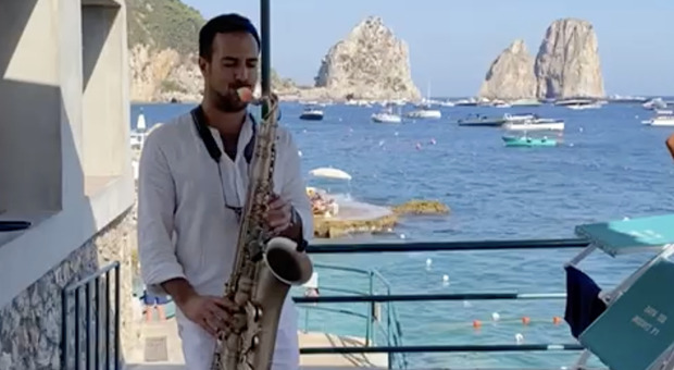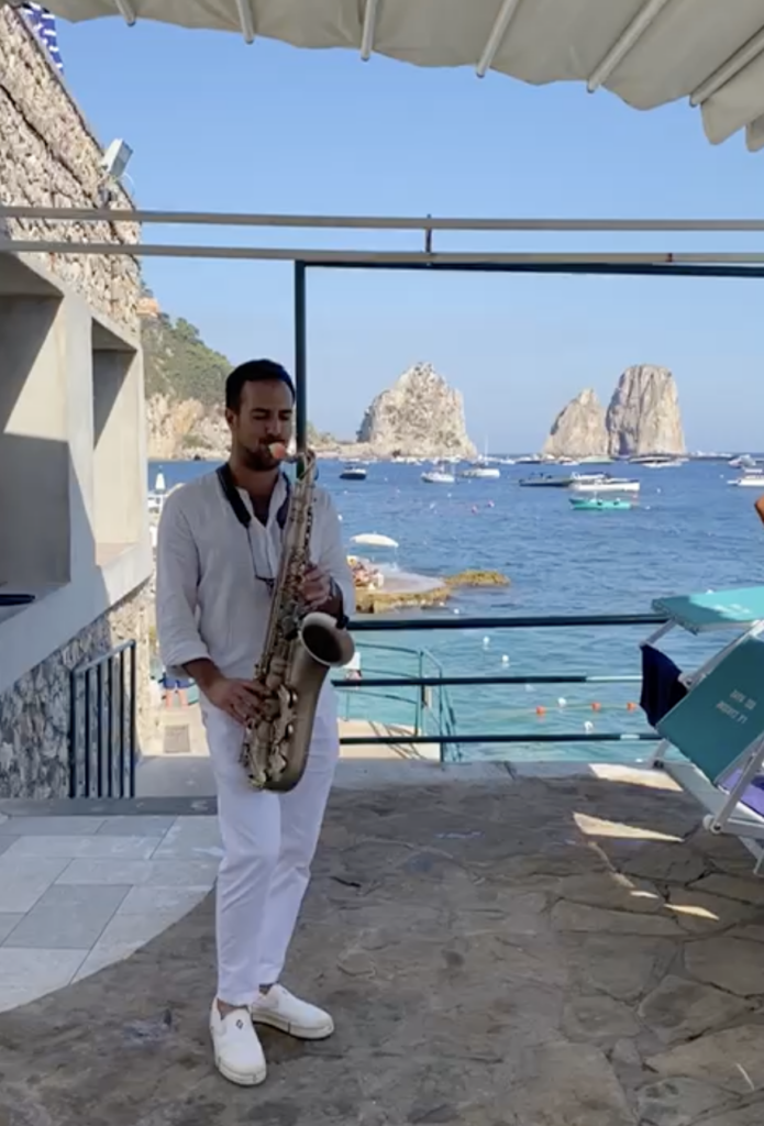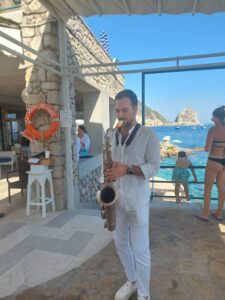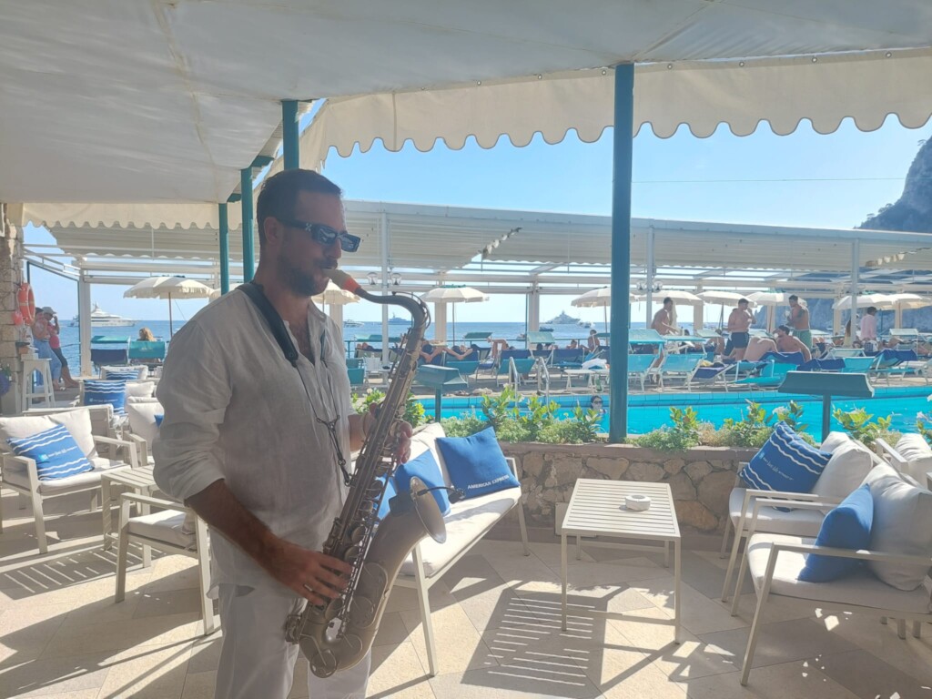 Sax in piscina del musicista caprese Marco Ruggiero e brioche con gelato è stata questa la sorpresa che La Canzone del Mare, lo storico beach resort dell’isola azzurra, ha voluto riservare ai propri clienti habitué nel giorno di Ferragosto. La Famiglia Iacono, patron dello storico stabilimento balneare creato da Gracie Fields, negli anni 50’, divenuto primo ritrovo della Dolce Vita di Capri, ha fatto preparare allo Chef della Canzone, Giovanni Fiore, un trionfo di calde brioche accompagnati da gelato multiuso, preparato sul tipico carrettino dei gelatai e servito sotto gli ombrelloni, sorprendendo gli esclusivi ospiti che frequentano l’elegante stabilimento balneare con vista che spazia a 360 gradi, dai Faraglioni a Punta Mulo. Una storia che continua ancora con la famiglia Iacono, che nel 3 millennio, con la 3 generazione, guidata degli imprenditori del mare la mamma Angela con i figli Ilaria, Chiara e Mario che seguono la scia tracciata dai loro nonni e genitori. Ovviamente la giornata è continuata con il brunch e sax al tramonto dove si sono levate le note del musicista caprese all’ombra dei faraglioni con gli yacht al largo che hanno assistito all’insolito concerto di Ferragosto sul mare.