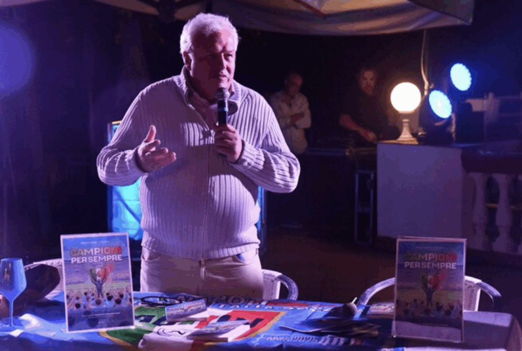 La passione prima di tutto. In 40 anni il calcio è cambiato ma rimane intatta la carica di amore per la squadra del cuore del Napoli club Capri. In una magnifica serata a tinte e cori azzurri sono stati ricordati con animo sensibile i fondatori e i tifosi storici non più in vita. La magia di un club isolano sta anche nel fatto che ogni partita è una trasferta anche in quelle casalinghe che, se in notturna obbligano a rientri a rarissima ora con barche noleggiate o aliscafi charter. Ma cosa non si fa per la maglia azzurra. Le feste per il quarto scudetto del Napoli continuano così anche a Capri. L’occasione è arrivata dall’anniversario del Club Napoli Isola di Capri che ha celebrato i suoi primi 40 anni di storia, da Diego Armando Maradona al quarto titolo tricolore, all’hotel San Michele di Anacapri, in uno dei punti più caratteristici e panoramici dell’Isola Azzurra. A celebrare la storia del club azzurro caprese, presieduto da Costanzo Ruocco, sono intervenuti tantissimi ospiti, tra i quali Gianluigi Lembo, Chansonnier dell’Anema e Core band che ha incendiato la serata con l’ereditaria allegria. Cori e balli. Poi ricordi e parole col presidente nazionale Ussi Gianfranco Coppola, storico giornalista riconosciuto da moltissimi tifosi tra cui Massimo Vignati figlio del magazziniere dei tempi dei primi due scudetti che ha messo su un piccolo ma emozionante museo di cimeli.