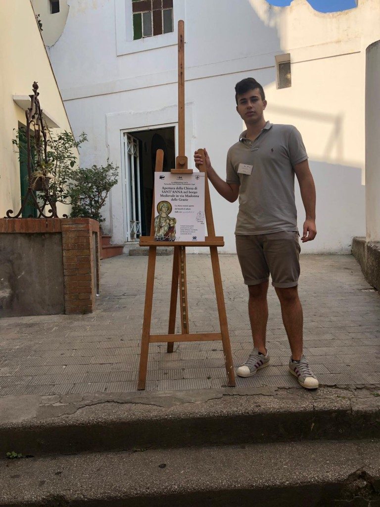 A toccare il cuore evidentemente non è solo tutto questo ben di Dio serbato nei vicoletti del borgo medievale. Ciò che completa e rende migliore la visita all’edificio sono l’accoglienza calorosa e solare di due giovani isolani, inseriti nel progetto “LucertolaBlu” dell’Associazione Culturale ANTEMUSSA. Sono, infatti, proprio Chiara Salvia e Costanzo Ruggiero a tenere aperta e disponibile la Chiesetta di Sant’Anna, con regolarità e dedizione. Né il caldo, né l’umidità, né la stanchezza di giorni febbrili come questi, sono stati in grado di abbattere o scoraggiare questi due giovani studenti, pronti a grandi sacrifici pur di portare a termine l’impegno preso con tanta amorevolezza e vissuto con altrettanta pazienza.