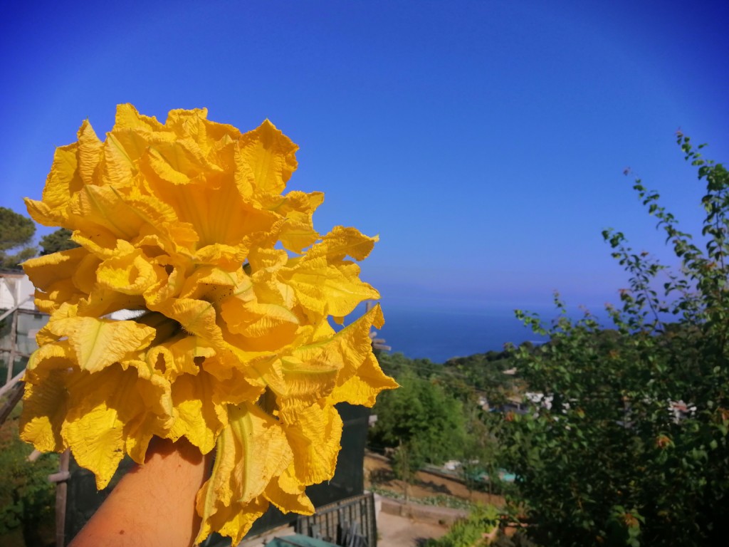 il momento di raccogliere di prima mattina un bel mazzo di fiori di zucca e
