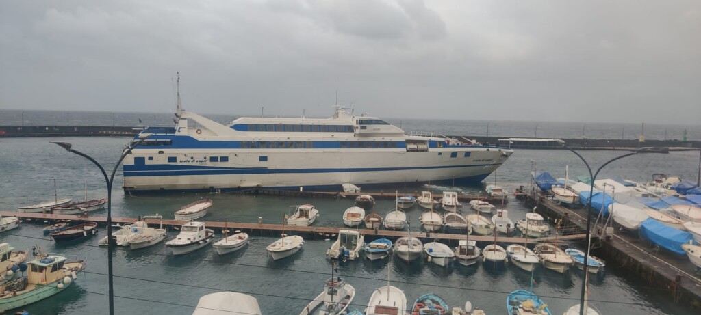 Il traghetto veloce della Caremar, Isola di Capri, in partenza per Calata di Massa alle 15.35, dopo aver chiuso il portellone e mollato gli ormeggi è stato investito da una potente raffica di vento che lo ha fatto ‘scorrazzare’ facendolo finire sul pontile galleggiante mobile dove erano ormeggiate alcune piccole imbarcazioni.