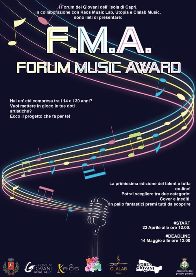 I Forum dei Giovani dell’isola di Capri, in collaborazione con Kaos Music Lab, Utopia, Clalab Music, presentano il “Forum Music Award”, un talent online rivolto a tutti i giovani isolani 14-30 che intendono mettere alla prova il proprio talento canoro.