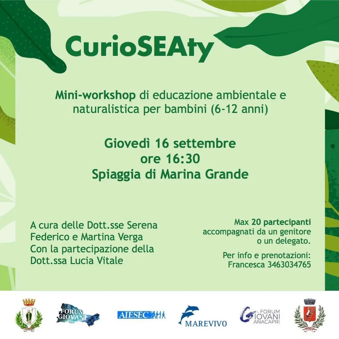 I Forum dei Giovani dell’Isola sono entusiasti di presentarvi il primo evento del progetto “Lead Nature – Isola di Capri” che si terrà il 16 settembre alle 16:30 presso la spiaggia di Marina Grande. L’idea è quella di fornire attraverso un Mini – workshop, piccole nozioni e buone pratiche sulla salvaguardia della specie marine che possano aiutare gli adulti di domani.L’evento è a cura dalle Dott.sse Serena Federico e Martina Verga.L’attività sarà supportata dall’associazione Marevivo Onlus, con la partecipazione della dott.ssa Lucia Vitale, già nota ai più piccoli dell’ isola per i suoi insegnamenti in materia.L’evento accoglierà max 20 partecipanti compresi in una fascia di età dai 6 ai 12 anni che dovranno essere accompagnati da un genitore o da un delegato.È possibile partecipare previa prenotazione telefonicaFrancesca 346 30 34 765.
