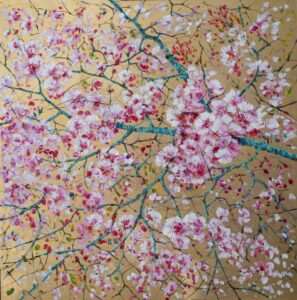 Prendendo ispirazione dalla prospettiva piatta della pittura giapponese, la rafforza col colore bianco rosato, un rosa intenso, quasi viola dei fiori. I rami sono azzurri e sembrano fiumi, o meglio arterie che solcano un’immensa superficie rossa conducendo un fluido pastoso e innervando i petali. Quasi che il punto di vista dell’artista per osservare i ciliegi non sia stato, come ci si potrebbe aspettare, dal basso verso l’alto oppure frontale, bensì dall’alto verso il basso, e ci trovassimo di fronte a una veduta aerea di una porzione di foresta, a una sorta di mappa geografica.