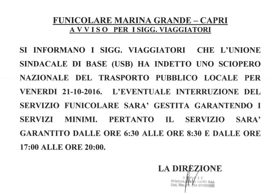 Funicolare di Capri, Comunicato avviso di servizio per sciopero nazionale dei trasporti.