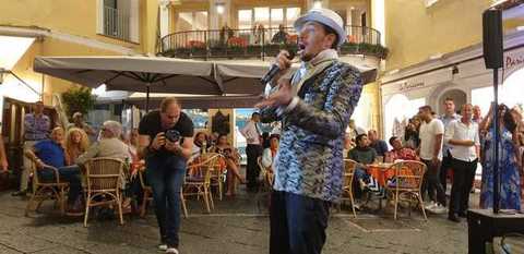 A Capri Giuseppe Gambi ha regalato ai suoi fan e ad una piazzetta in festa piena di turisti, provenienti da ogni parte del mondo, il meglio delle sue esibizioni dei primi dieci anni di carriera. Nella sua ormai celebre scaletta “cross over” da tenore pop Gambi ha alternato i grandi classici della musica lirica da “Nessun Dorma” a “E lucevan le stelle”, le sue rivisitazioni pop dei brani storici della musica napoletana da “Reginella” a “’O sole mio”, i grandi successi internazionali che raccontano l’italianità nel mondo da “That’s amore” a “Mambo italiano”, i suoi omaggi ai grandi della musica italiana da Andrea Bocelli a Pino Daniele e i suoi brani più celebri come “Italia Patria Mia”. Un colpo d’occhio straordinario vedere turisti di ogni parte del mondo ballare, seguendo i ritmi della musica italiana, in uno dei luoghi simbolo delle bellezze del Belpaese.