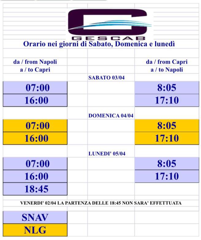 La Gescab ha comunicato il quadro orario dei collegamenti per Napoli e Sorrento durante le festività pasquali. A partire da domani sono ridotte le corse in considerazione del passaggio in zona rossa che comporta un calo di mobilità sulla vie del mare.